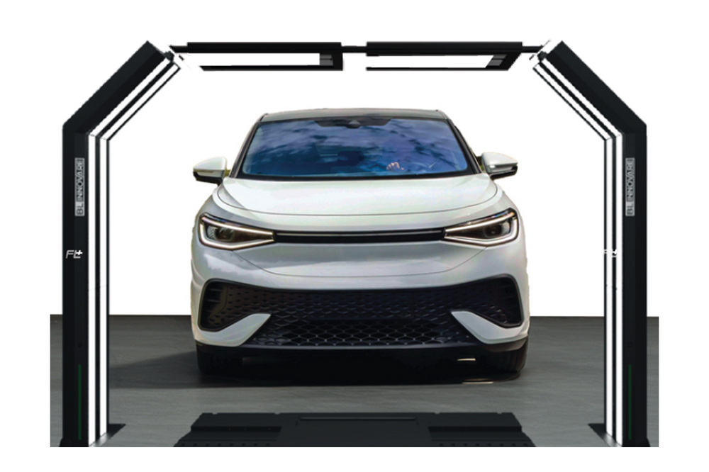 Dispositivo di controllo dell'allineamento ruote laser automatico e rilevamento danni alla carrozzeria in movimento tramite IA.