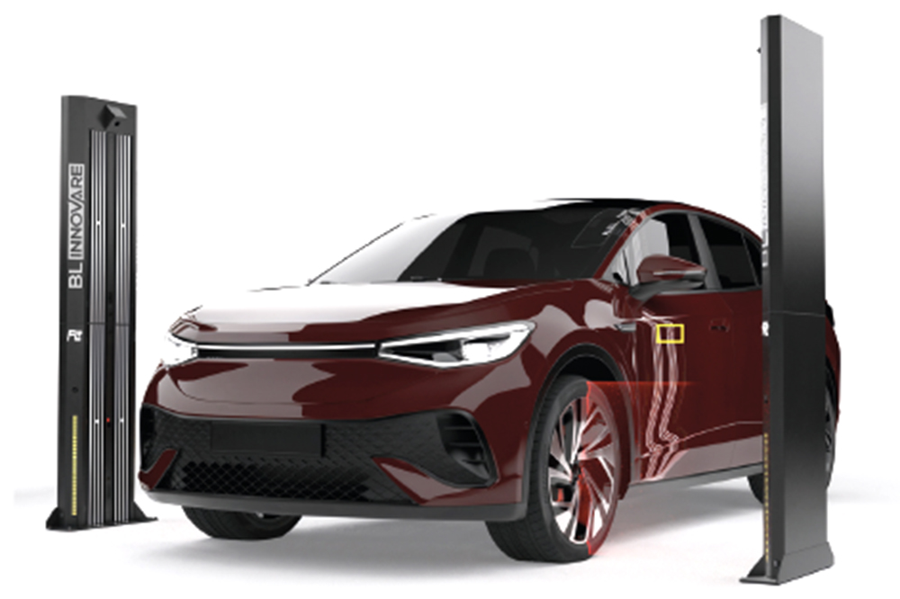 Dispositivo di controllo dell'allineamento ruote laser automatico e rilevamento danni alla carrozzeria in movimento tramite IA.